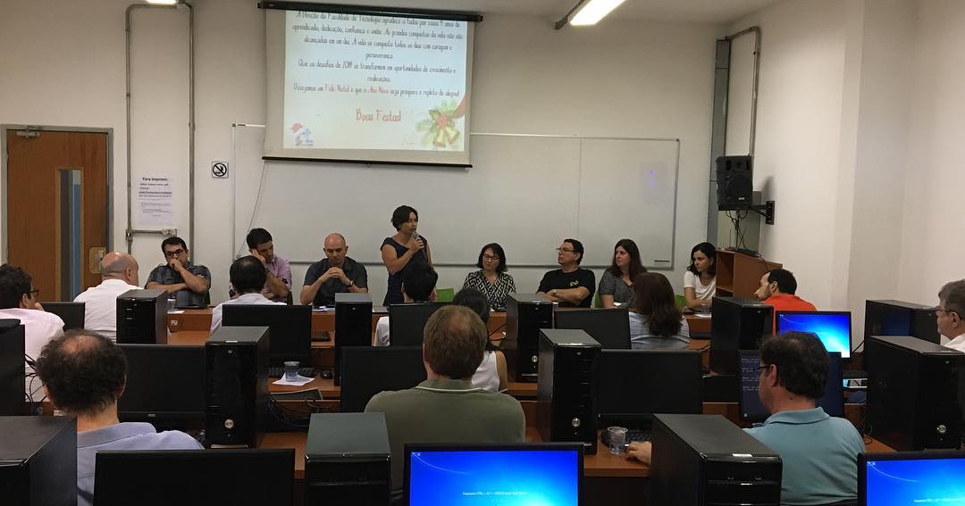 Ocorreu nesta tarde (13), a última Reunião Ordinária da Congregação do ano de 2018. Na oportunidade, a Diretora da FT, Profa. Dra. Luísa Gachet, agradeceu a sua equipe pela dedicação durante os seus 4 anos de gestão. E aproveitou para desejar boa sorte aos novos diretores da FT, Prof. Dr. Renato Falcão e Prof. Leonardo Bravo. Após os agradecimentos da mesa houve um breve momento de confraternização entre os membros da Congregação.