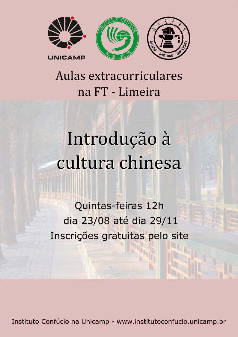 O Instituto Confúcio na Unicamp irá oferecer cursos gratuitos de introdução a cultura chinesa na FT - Limeira nesse semestre. Ele irá abranger vários tópicos sobre a língua e cultura chinesa e em 2019 planejamos abrir um curso de extensão de ensino de mandarim na FT.
