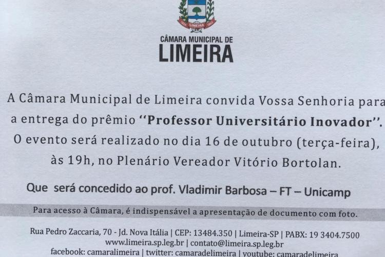 out 16 2018 Com muita alegria e satisfação repassamos o Convite para a entrega do prêmio "Professor Universitário Inovador" ao Prof. Vladimir Barbosa. O evento ocorrerá hoje, dia 16 de outubro, às 19h, no Plenário Vereador Vitório Bortolan.