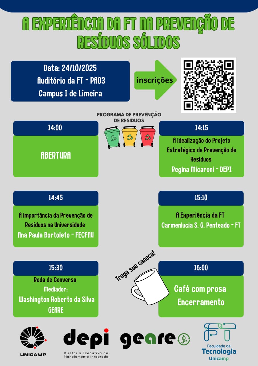 Na próxima sexta-feira, 24 de outubro, das 14h às 16h, será realizado um encontro sobre prevenção de resíduos na sala PA03 da Faculdade de Tecnologia (FT). A iniciativa faz parte das ações da Câmara Técnica de Gestão de Resíduos da Unicamp e tem como objetivo discutir práticas e alternativas para a redução da geração de resíduos na universidade.