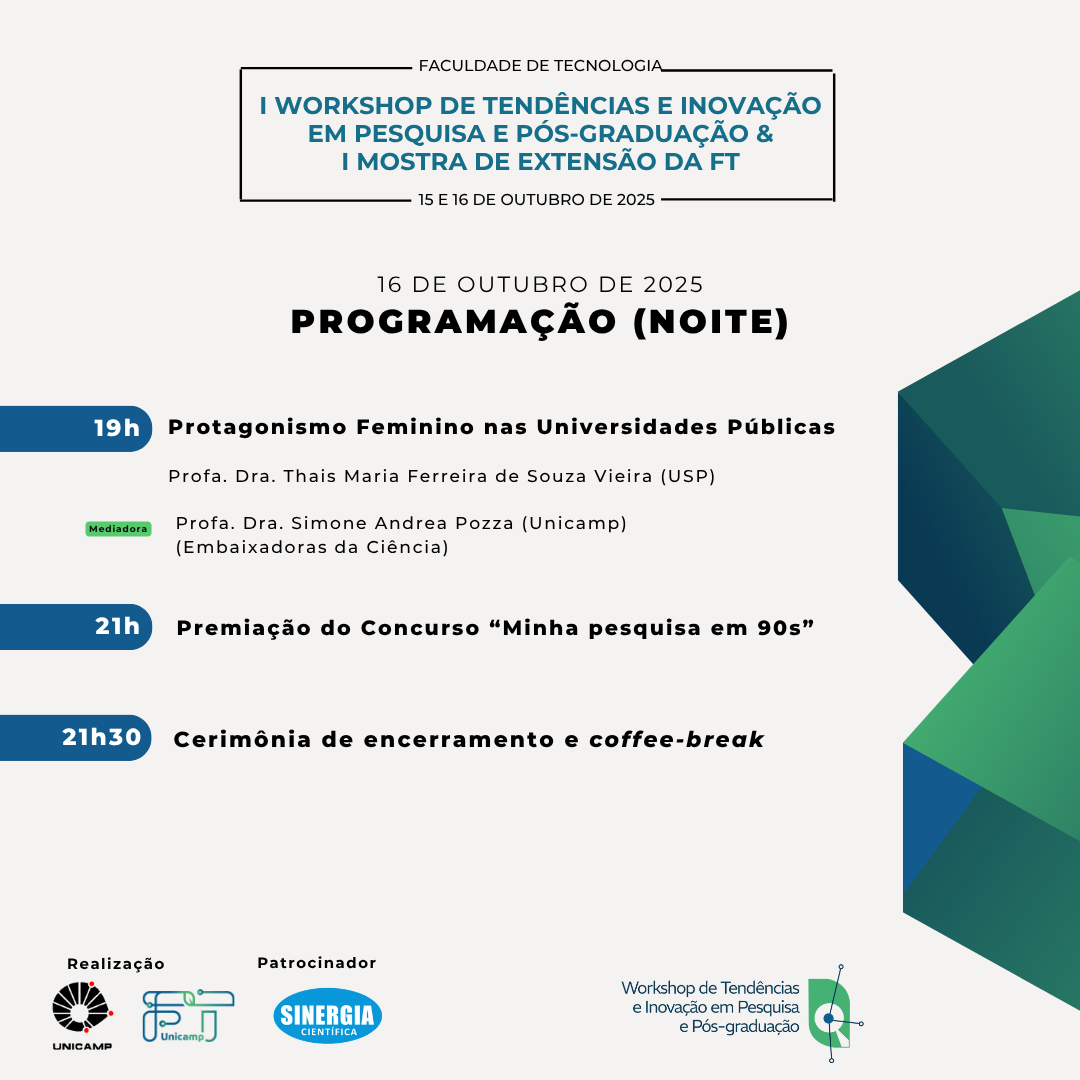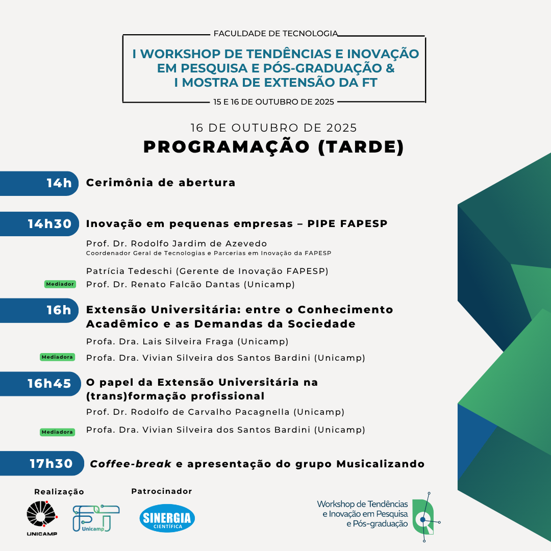 O Workshop, organizado pelas áreas de Pesquisa e Pós-Graduação, tem como objetivo debater as inovações que impactam a ciência, o ensino e a sociedade, promovendo a integração entre a Unicamp, a USP e outras instituições parceiras, além de fortalecer a cooperação científica e a troca de experiências. Já a I Mostra de Extensão da FT está sendo organizada pela Coordenadoria de Extensão da Unidade e visa à divulgação das ações de extensão desenvolvidas na Faculdade de Tecnologia, destacando a relevância dessas iniciativas na aproximação entre universidade e sociedade.
