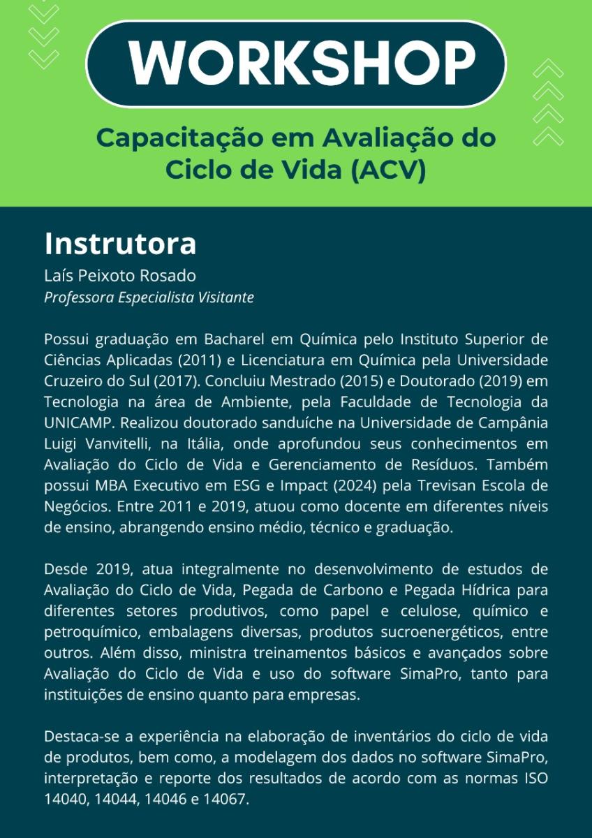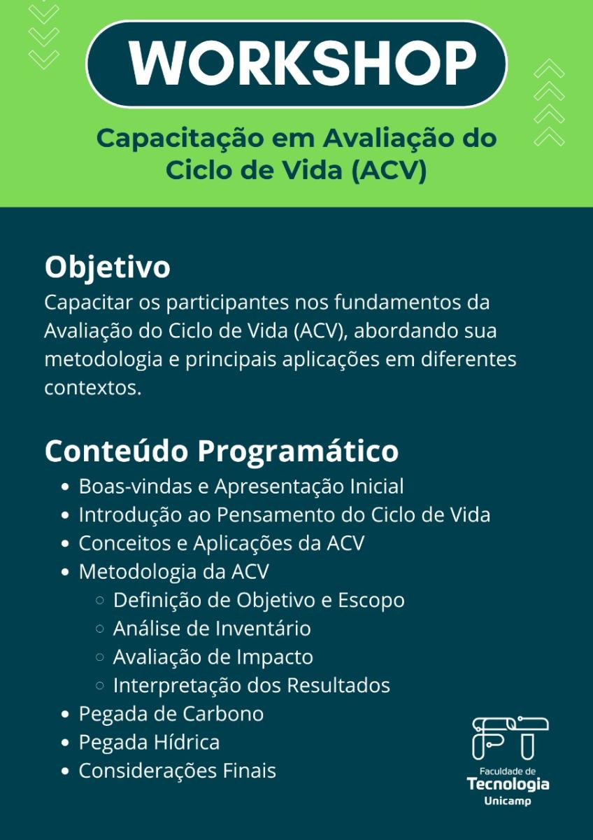 Acontecerá na Faculdade de Tecnologia o Workshop de Capacitação em Avaliação do Ciclo de Vida (ACV), cujo objetivo é qualificar os participantes nos fundamentos da ACV, abordando sua metodologia e principais aplicações em diferentes contextos.